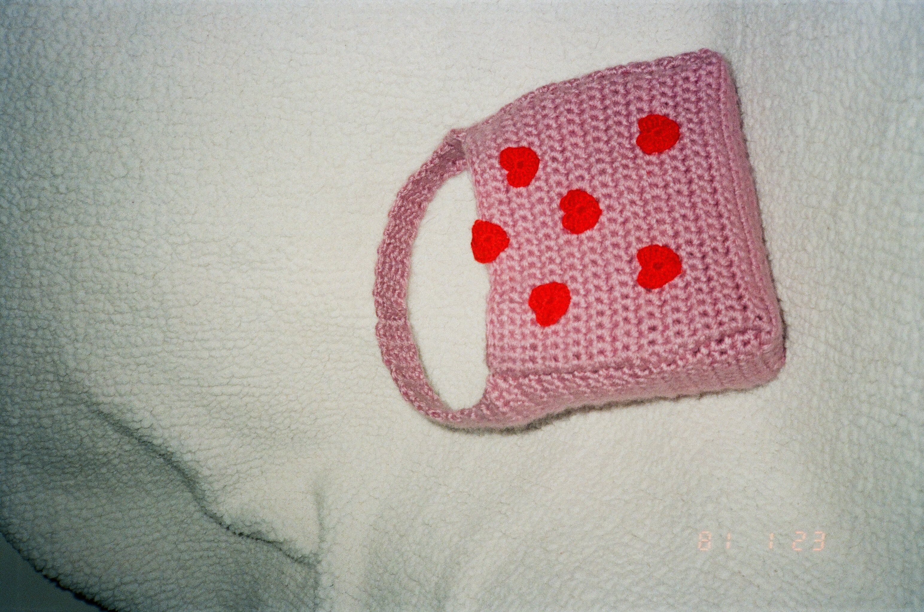 A crochet pink hearts shoulder bag. A gift for Aika.