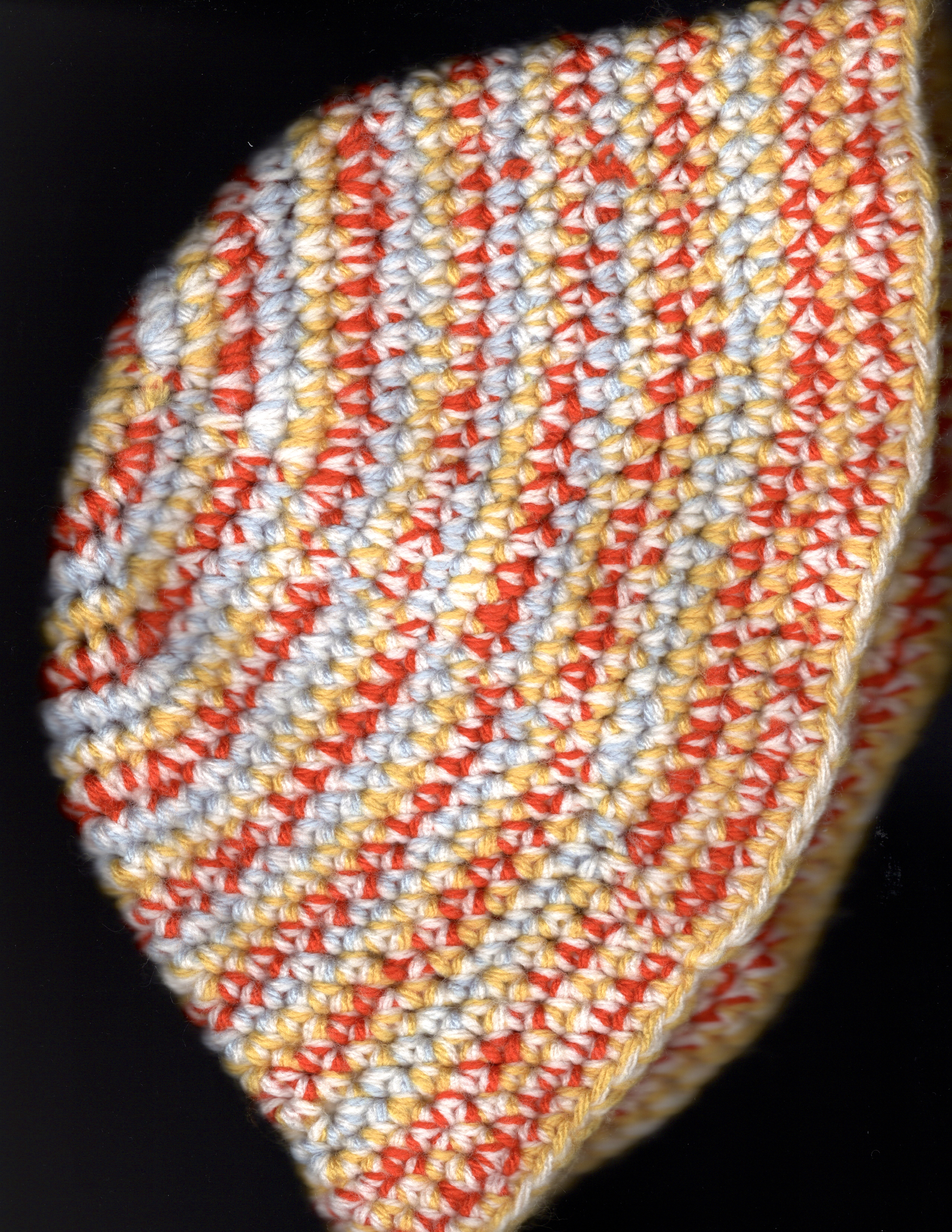 A crochet bucket hat using scrap yarn.