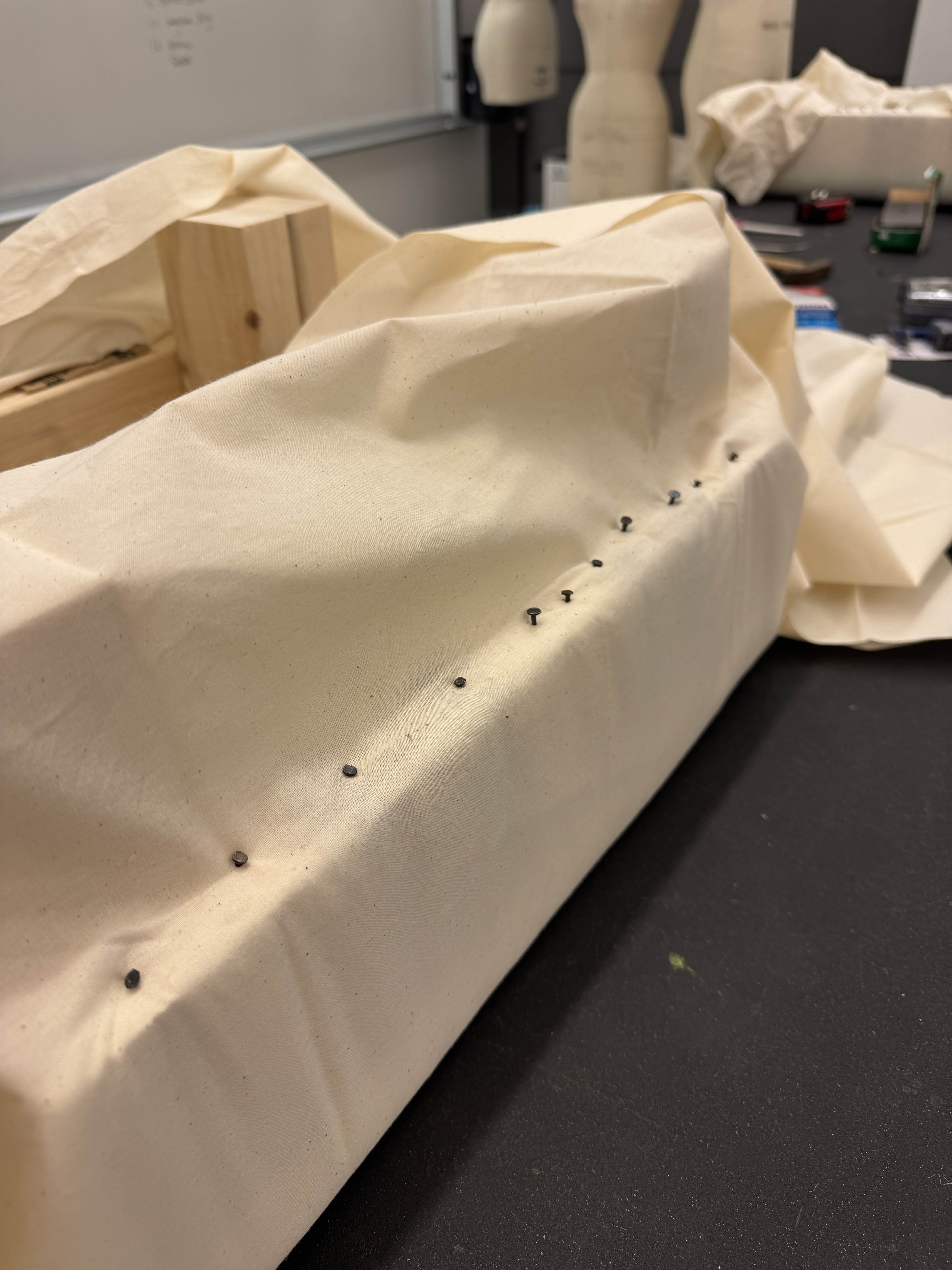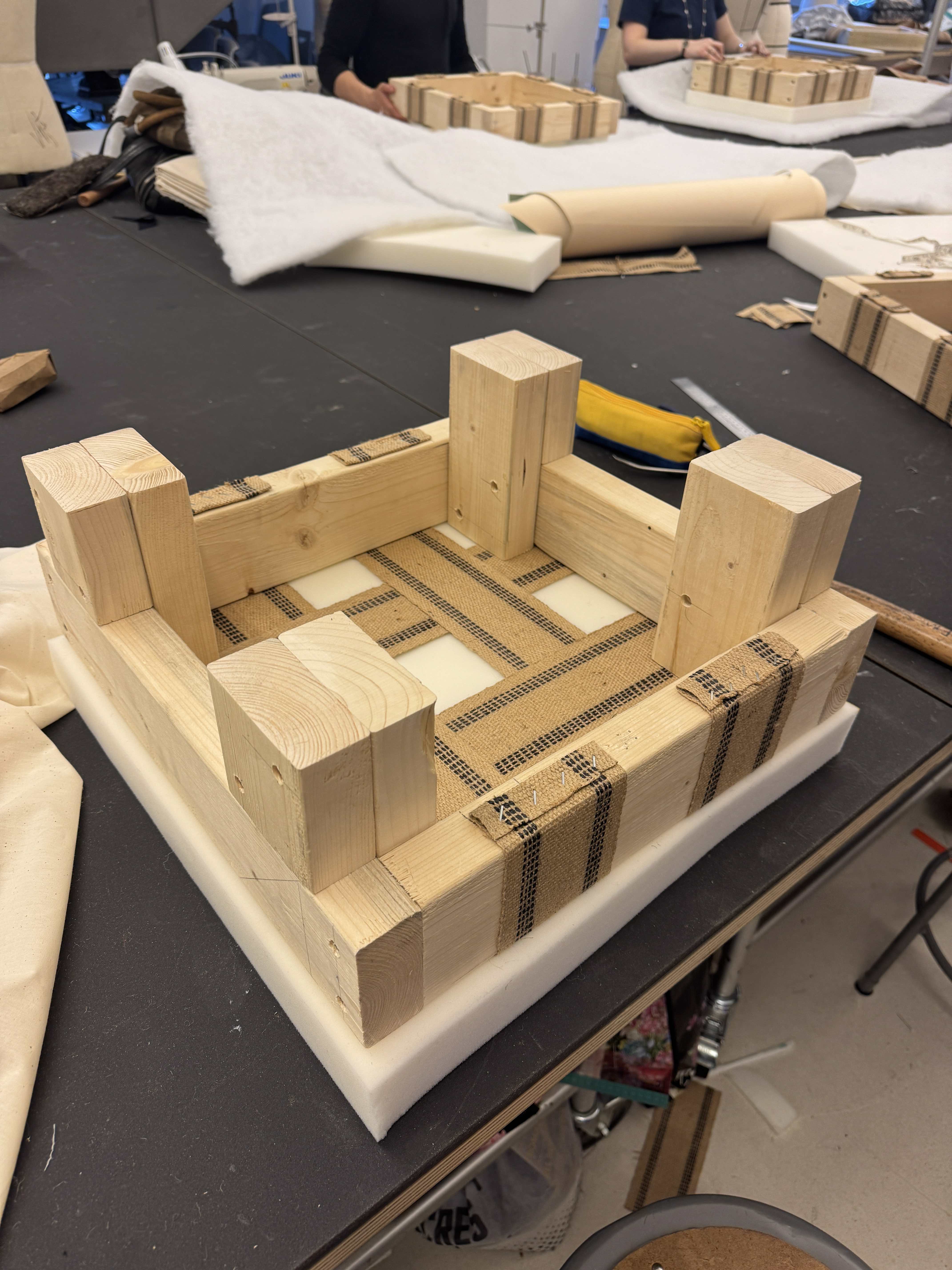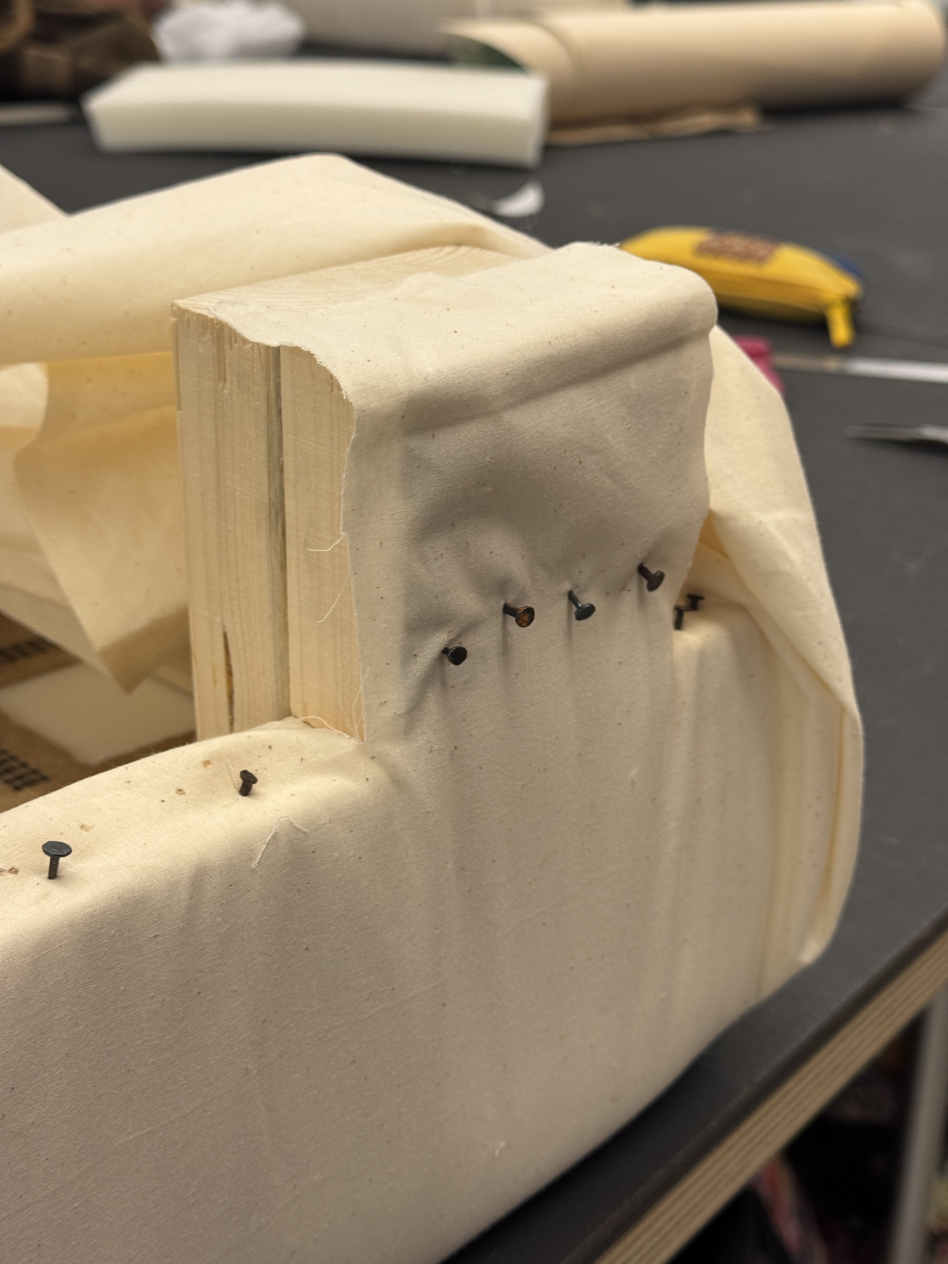 For the Slip Seat project, I cut down an 8’ long, 2” thick, 4” wide pine board into pieces to create the frame, I also added legs using the leftover wood and made it into an ottoman. I then used webbing, foams, batting, muslin, and a nice top fabric and created the rest of the seat. To cover up the legs, I sewed these leg covers so the wood wouldn’t show and all the staples are hidden for a cleaner look.