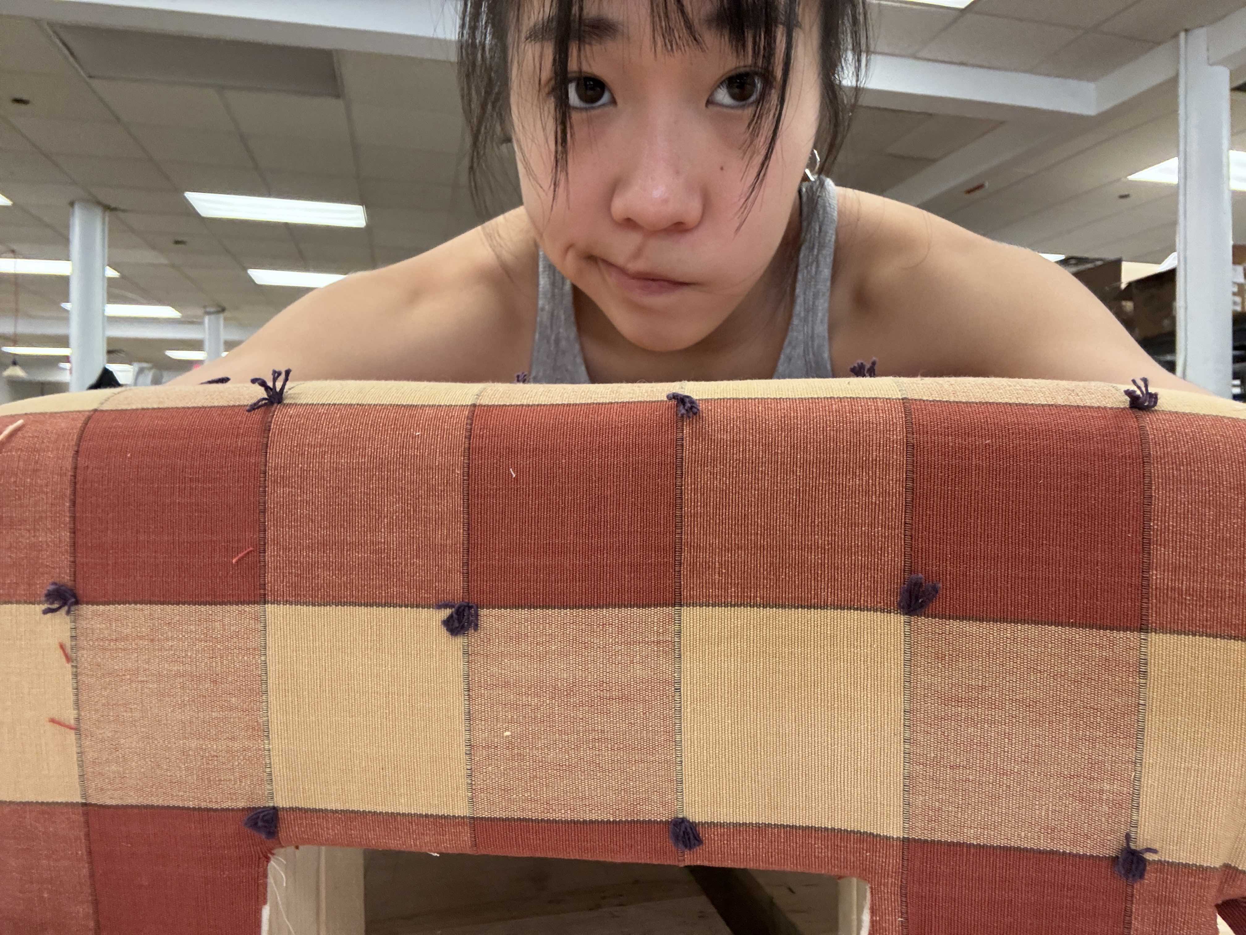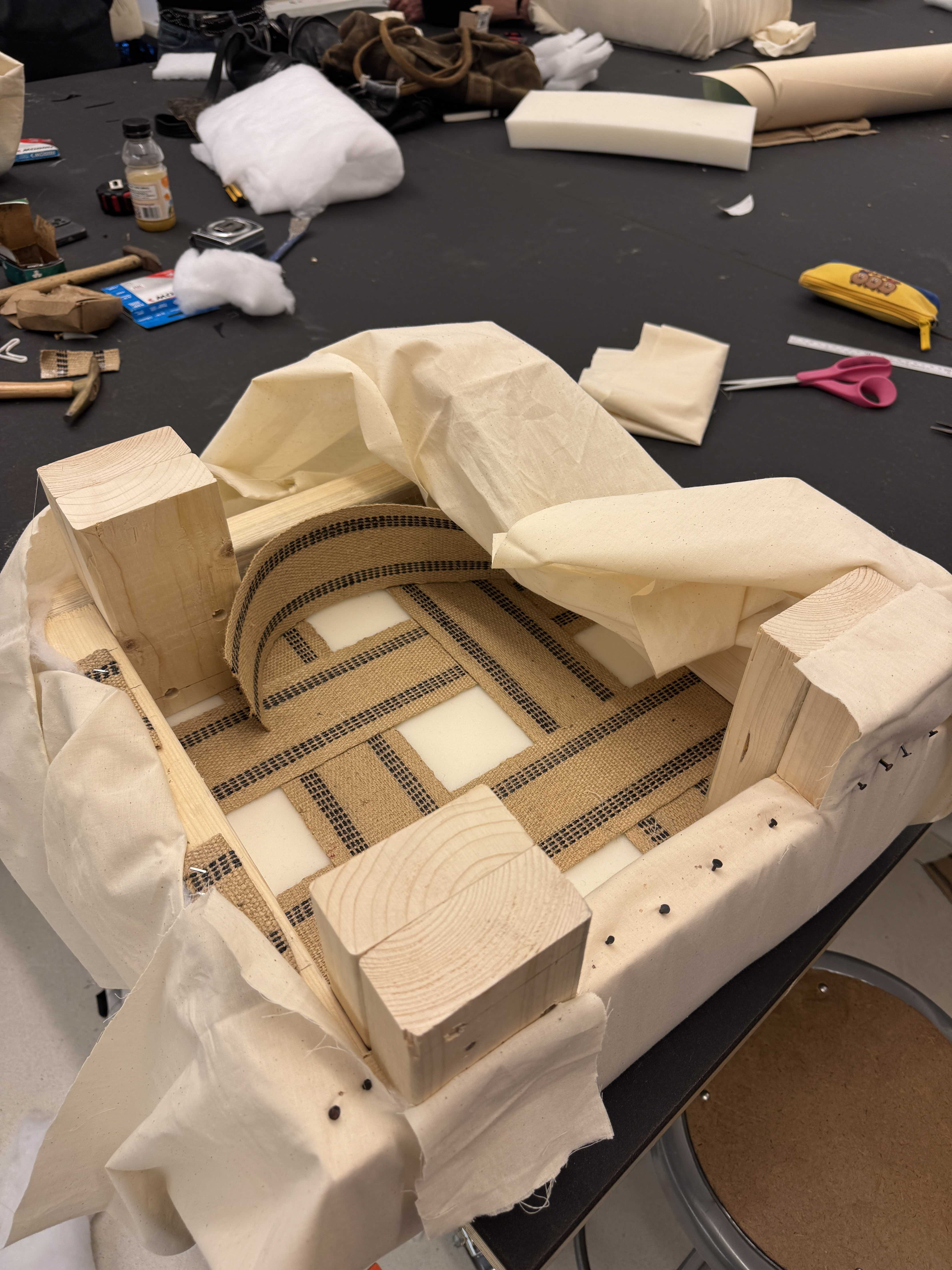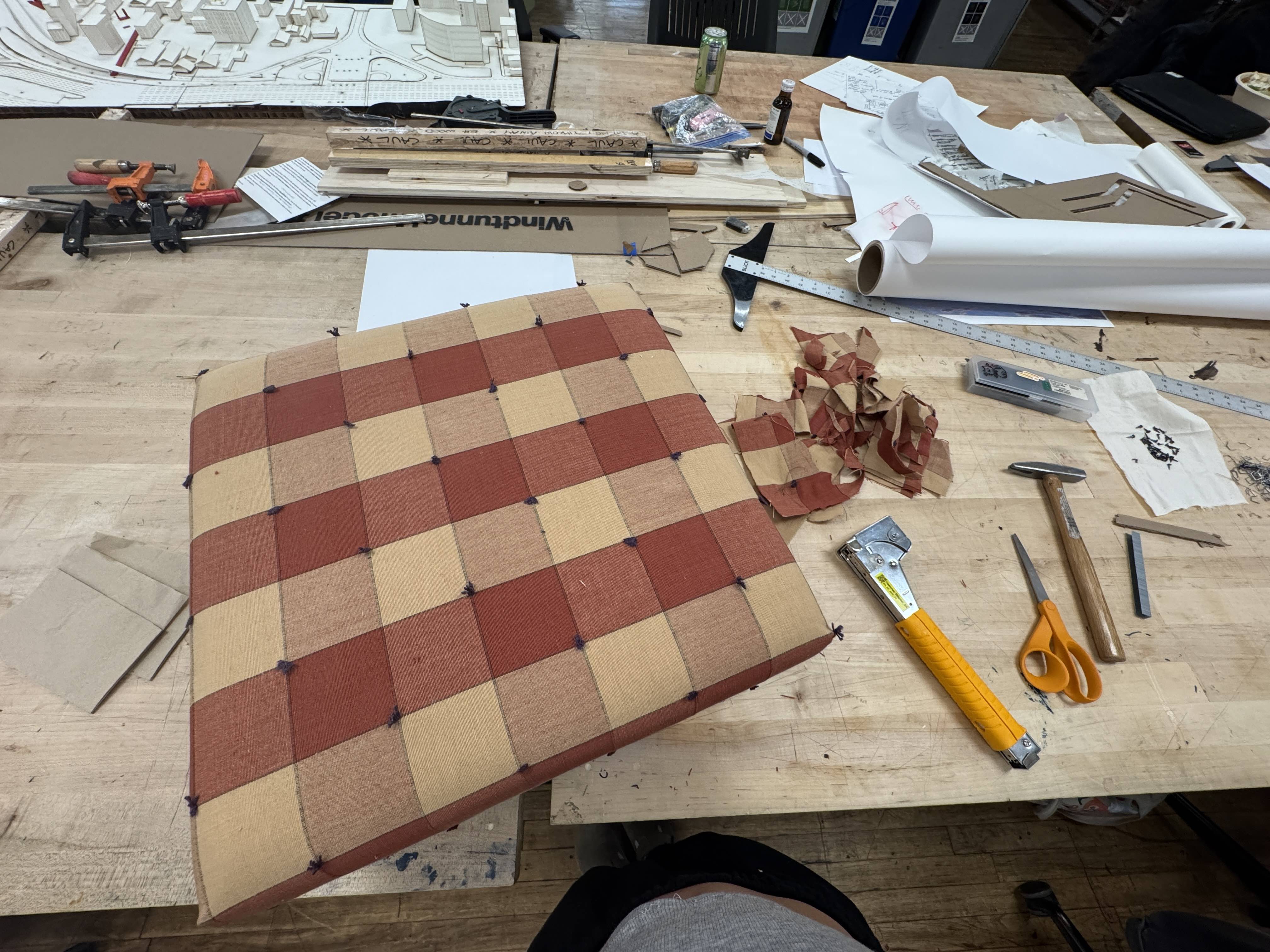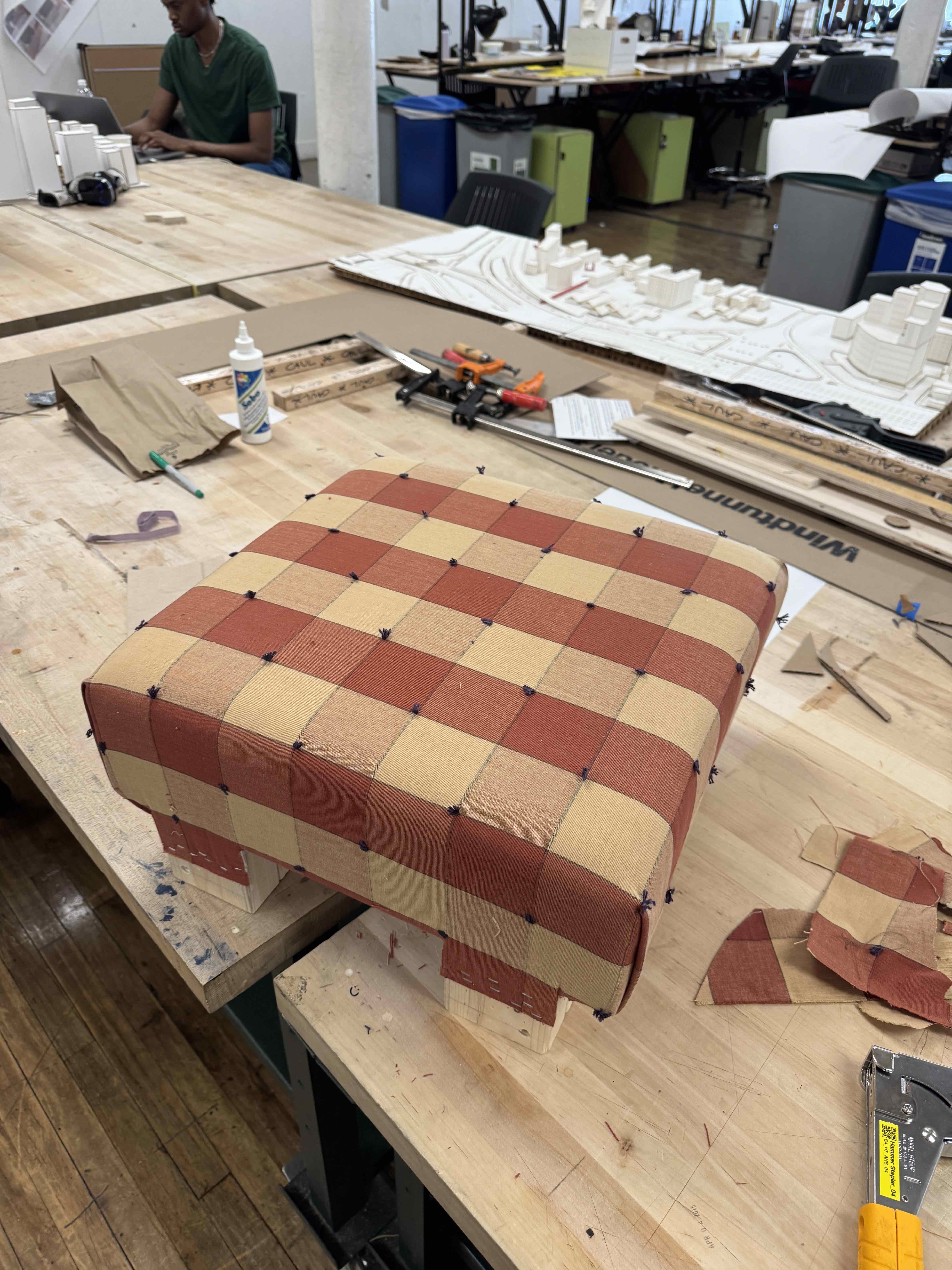 For the Slip Seat project, I cut down an 8’ long, 2” thick, 4” wide pine board into pieces to create the frame, I also added legs using the leftover wood and made it into an ottoman. I then used webbing, foams, batting, muslin, and a nice top fabric and created the rest of the seat. To cover up the legs, I sewed these leg covers so the wood wouldn’t show and all the staples are hidden for a cleaner look.